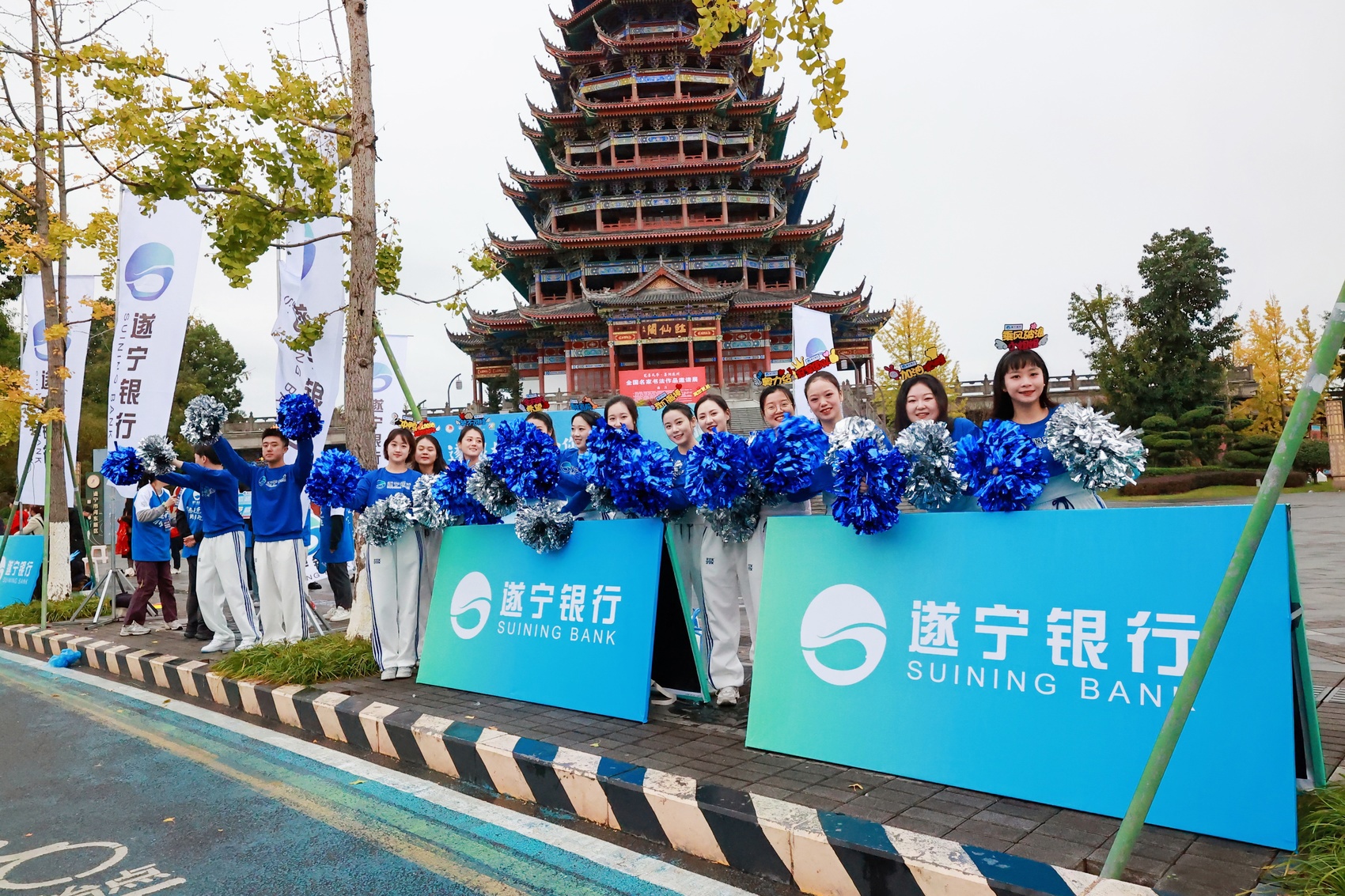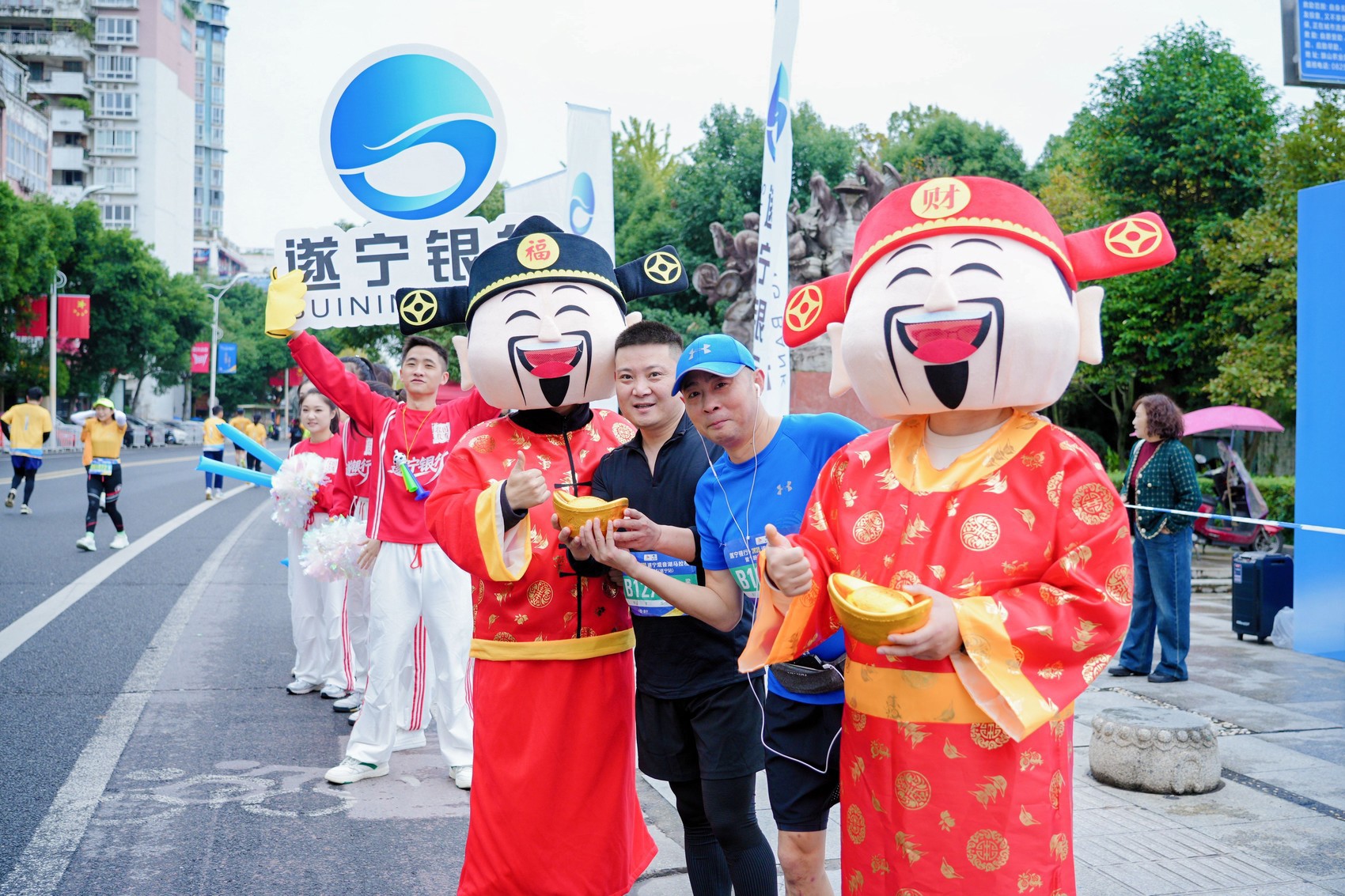 从起点到终点,遂宁银行助威团以多元形式为选手注入能量。音乐啦啦操用动感节拍点燃赛场激情,“财神降临”方阵为选手送上吉祥祝福,定制手举牌与加油呐喊声交织,将赛事氛围推向高潮。这些精心设计的应援环节,不仅是对跑者的实时激励,更是将“赛事流量”转化为“城市留量”的生动实践。