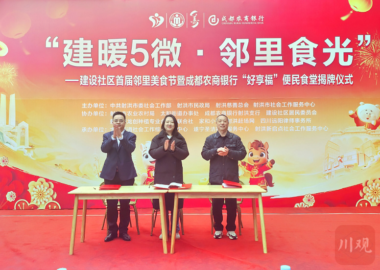 活动现场,建设社区、成都农商银行射洪支行与有爱餐饮公司共同签署了联建合作协议,承诺协同为居民提供安全、便捷、实惠的餐饮服务,切实提升社区生活的幸福感与获得感。