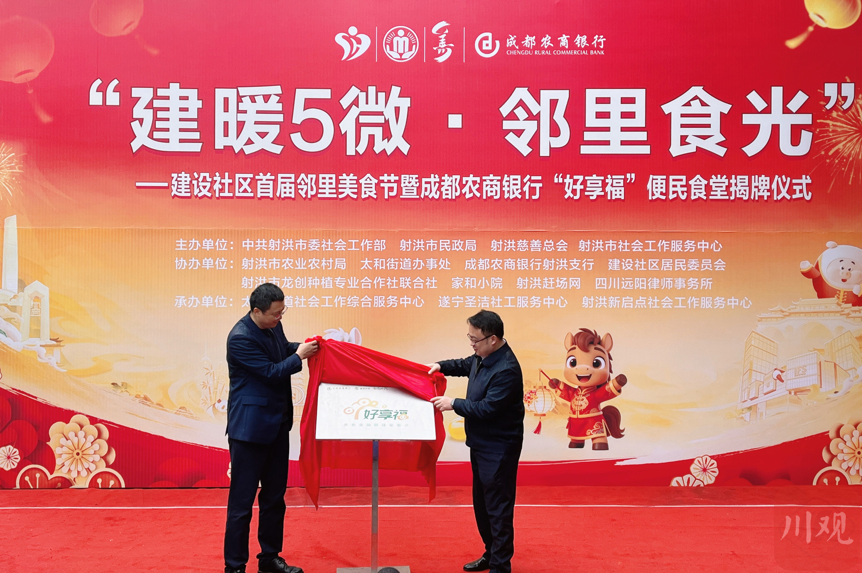 2月8日,射洪市太和街道建设社区“家和小院·好享福”便民食堂正式揭牌运营。该食堂由建设社区、成都农商银行射洪支行、四川有爱餐饮服务有限公司联合共建,是射洪市完善“15分钟养老服务圈”的关键一环,旨在让辖区居民,特别是老年群体,在家门口即可享受到便捷、实惠、优质的助餐服务,感受社区关怀。