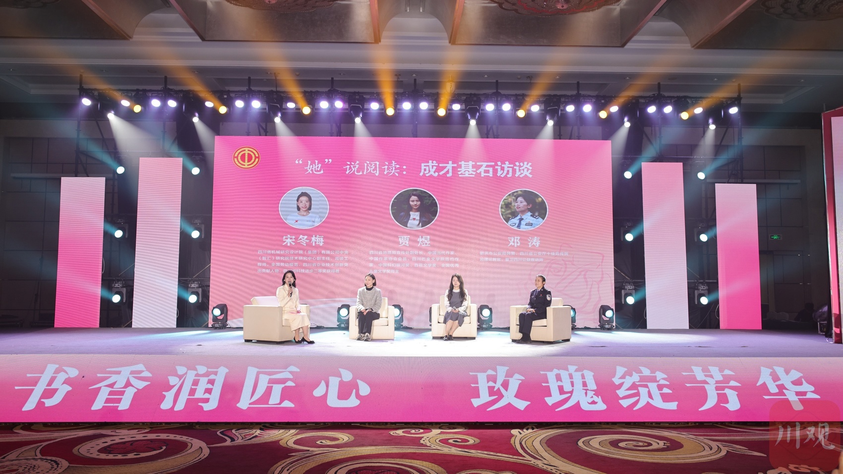 AI人机互动《书香筑梦向未来》则以前沿科技视角,探讨智能时代纸质阅读的独特价值。在‘她’说阅读:成才基石访谈”环节中,全国劳动模范、四川省机械研究设计院高级工程师宋冬梅,分享了在科研攻坚最艰难时,从书籍中收获精神力量、打开思维视野的故事;百花文学奖得主、四川省地质局宣传处副处长贾煜,讲述了她在地质勘探一线,将地质与文学跨界融合,让“地质科幻”成为个人作品独树一帜标签的历程;四川省公安厅十佳宣传舆论理论教官、射洪市公安局民警邓涛,则以书本为“精神坐标”,讲述了自己带着阅读走进校园,让法治的底线在文学的土壤中扎根,用文学的温度传递法治的力度,让理性与共情在阅读中交融。