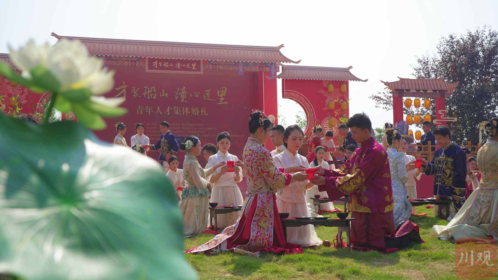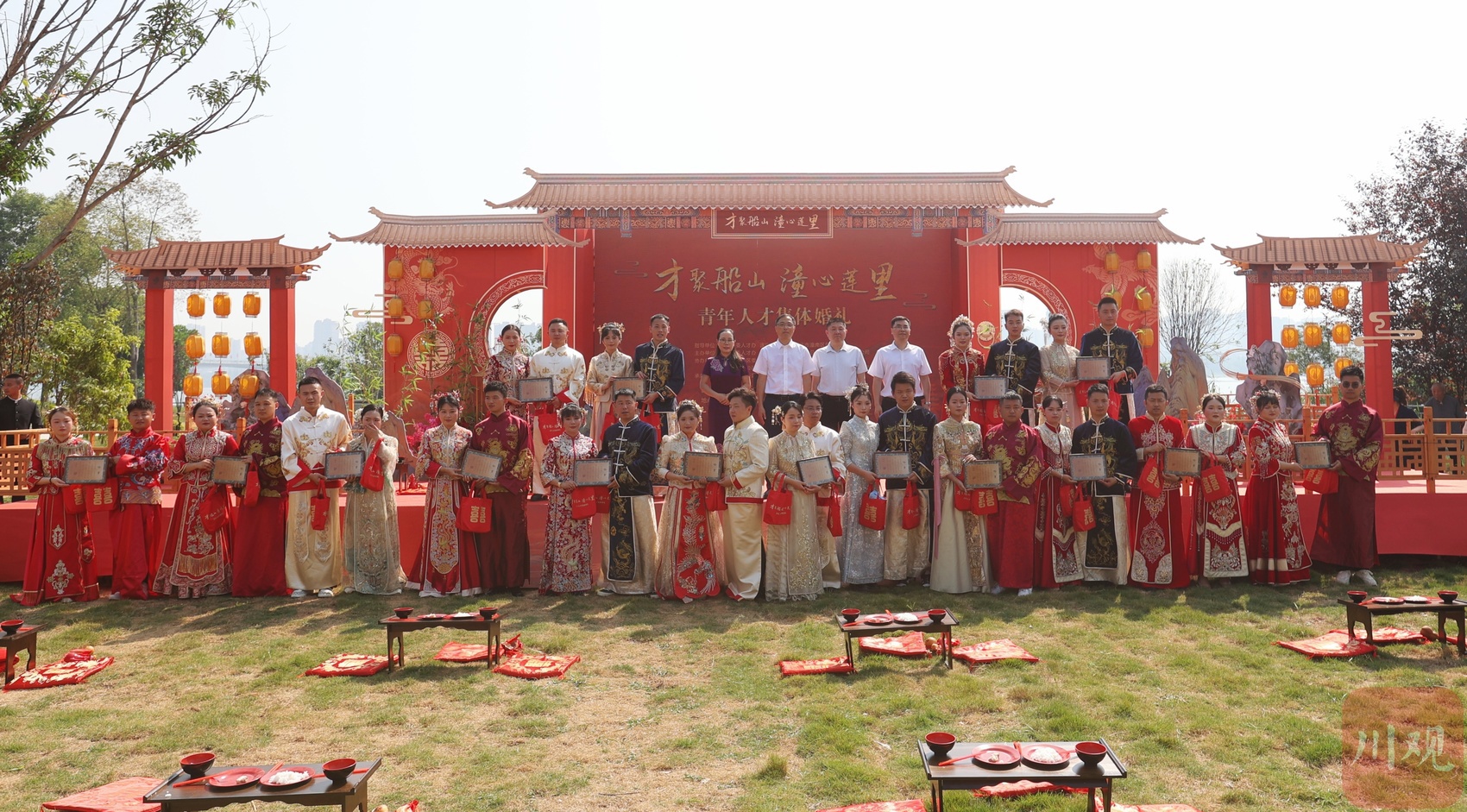 本次青年人才集体婚礼主题为“才聚船山·潼心莲里”。上午8时58分,伴随着欢快的音乐,集体婚礼拉开帷幕。活动现场,新人们身着传统婚服,依次完成祈福、却扇、结发等9项仪式,并在《家庭公约》上签字,将“简约文明”的婚恋新风融入仪式细节。