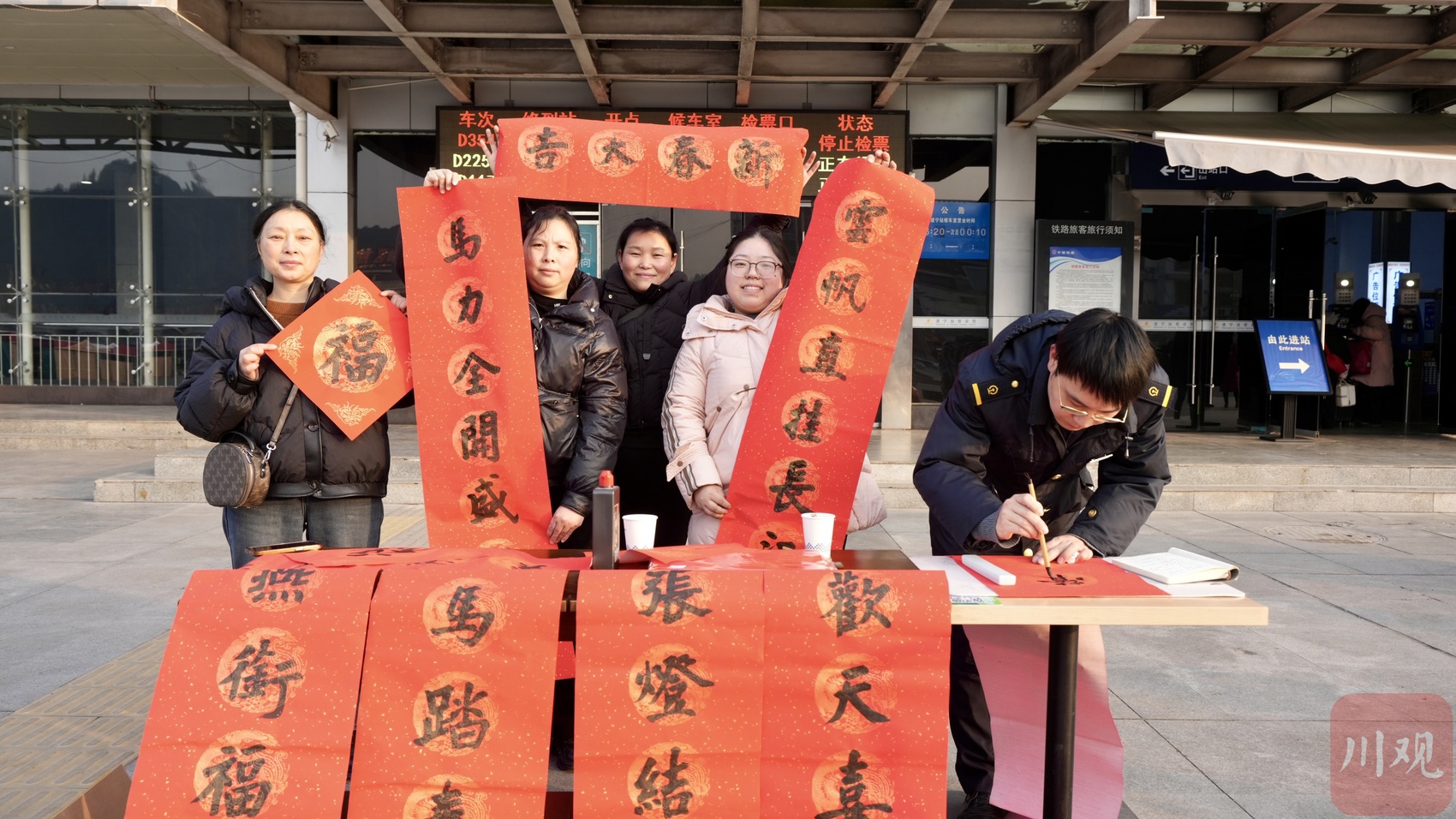 2月2日,2026年春运正式启动,将持续40天时间。当天,在遂宁火车站站前广场,旅客王女士接过工作人员手写的春联——“事事如心大吉利,家家顺意永安康”,笑意盈盈地收进背包,“没想到赶春运还能收到春联,一下子就有年味了。”