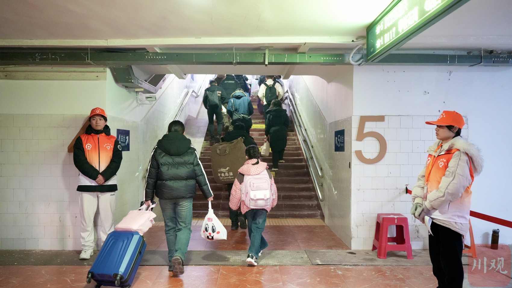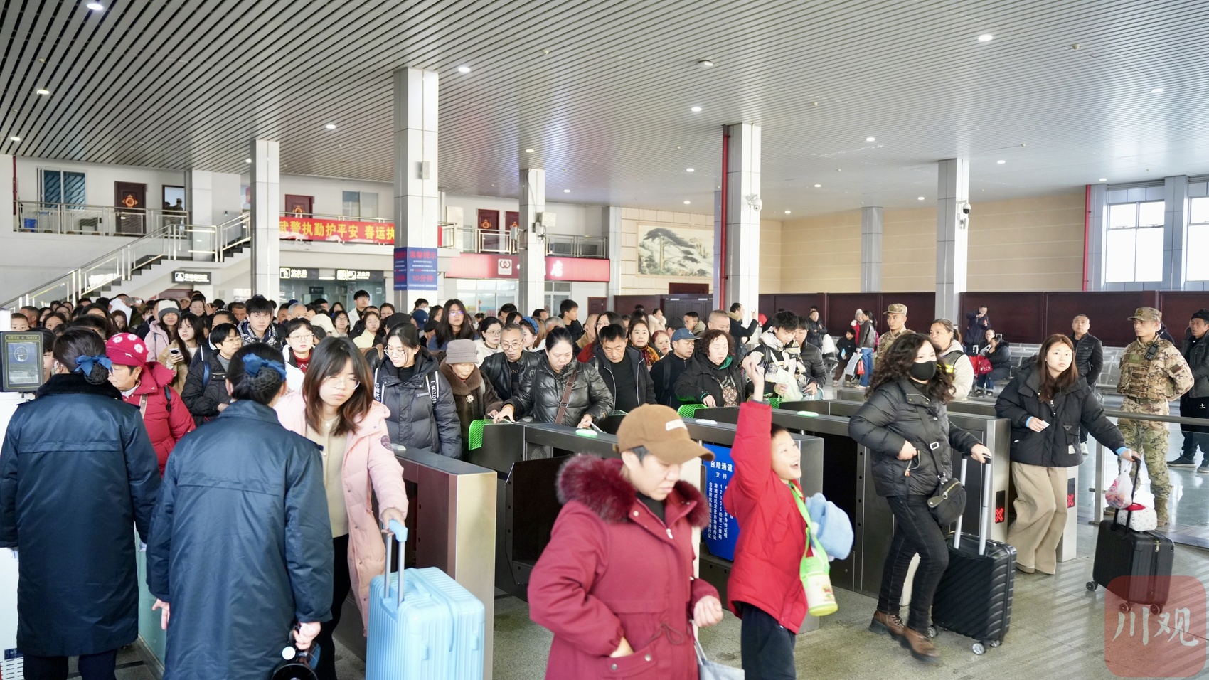 一副副春联传递着温馨祝福,也展现出遂宁面对春运“大考”的周全准备与民生温度。由于遂宁火车站内部施工,所有列车实行“提前10分钟停止检票”。面对春运客流高峰,车站通过广播、提示牌、现场引导等多种方式,反复提醒旅客合理安排时间。“我们增派了人手加强引导与服务,确保旅客即使提前停检也能顺利乘车。”遂宁火车站党总支书记李玉彬介绍。