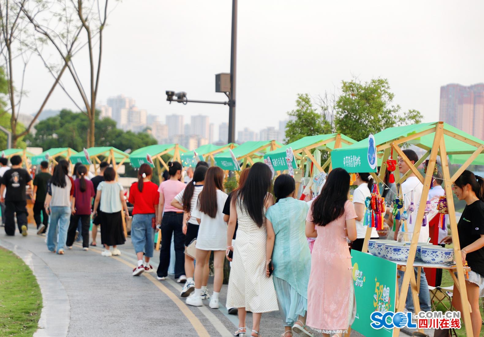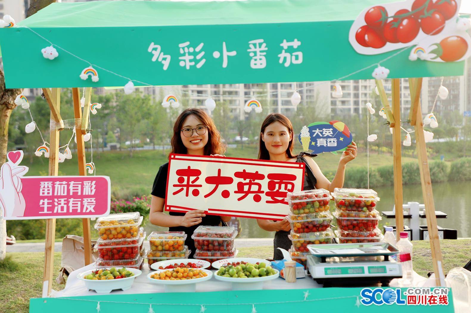 特色展区更显大英文化底蕴——久大盐业的展台上,各式盐制品为大英代“盐”;农产品展台上,回马镇的彩色番茄如宝石陈列,蔬菜面条以缤纷色泽吸引食客驻足。市集特别设置的文旅礼品互动区也笑声不断,团扇、香囊等礼品让市民游客参与感满满。