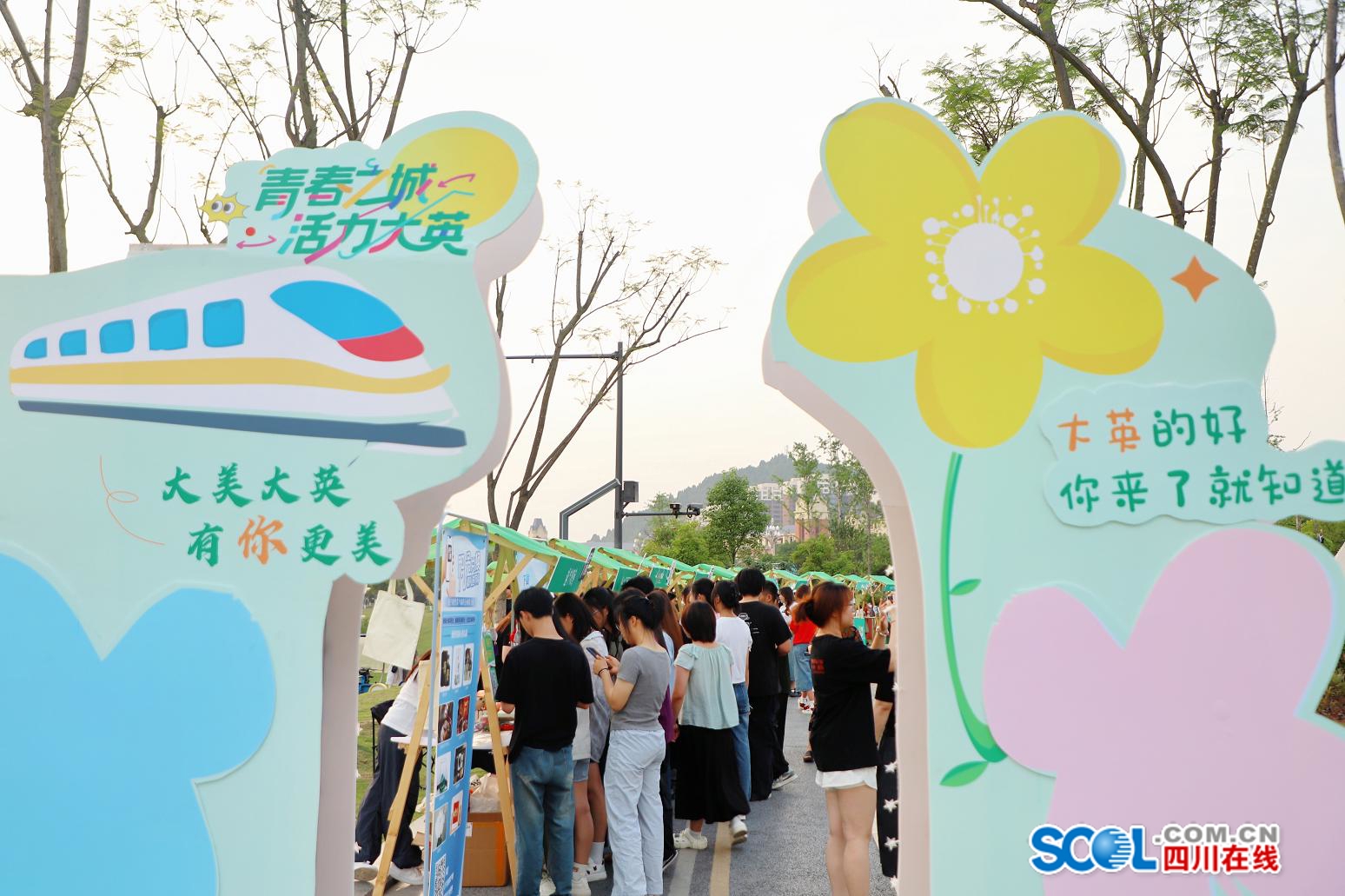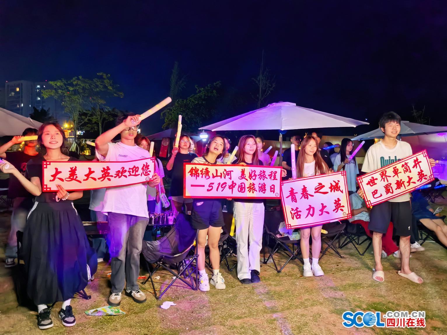 5月18日傍晚,大英县星空·音乐营地的夜空被荧光棒点亮,大英县2025年“5.19中国旅游日”之“青春大英·慢生活市集”在此拉开帷幕,吸引众多市民游客汇聚于此。