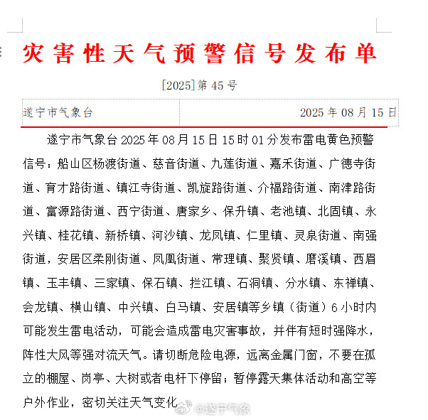 遂宁市气象台8月15日15时01分发布雷电黄色预警信号: