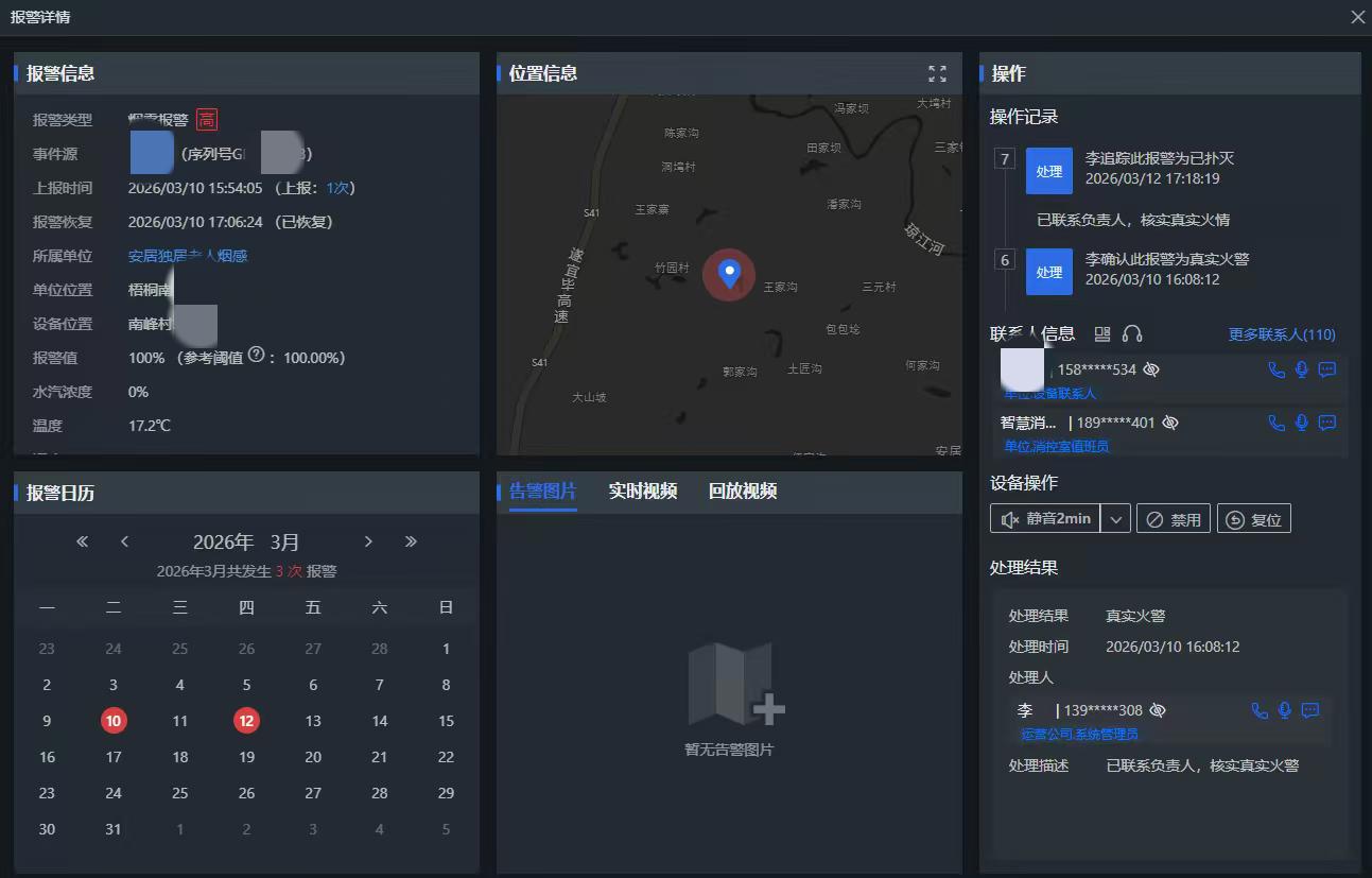 4月9日9时,遂宁经开区南强街道龙坪新居小区一住户老人煮鸡蛋时熟睡,锅中水烧干产生大量烟雾触发报警。遂宁市智慧消防运维中心平台监控中心收到警情后,立即启动联动机制,预警信息同步推送至该社区网格员,值守人员联动物业赶赴现场清理隐患、化解险情,事后该中心工作人员及时到达现场维护设备并做处置调查。