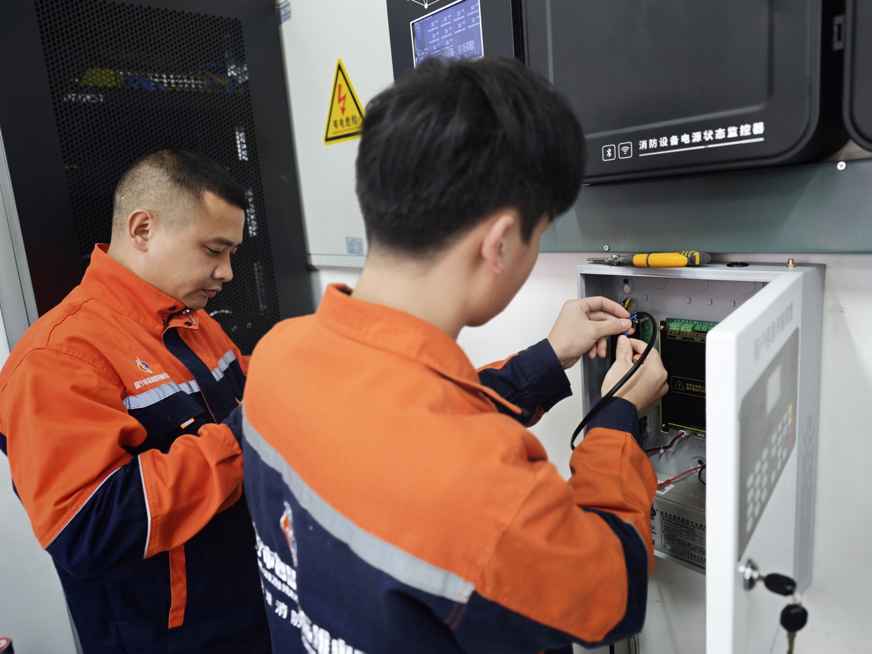 遂宁市智慧消防运维中心工作人员正在安装调试设备