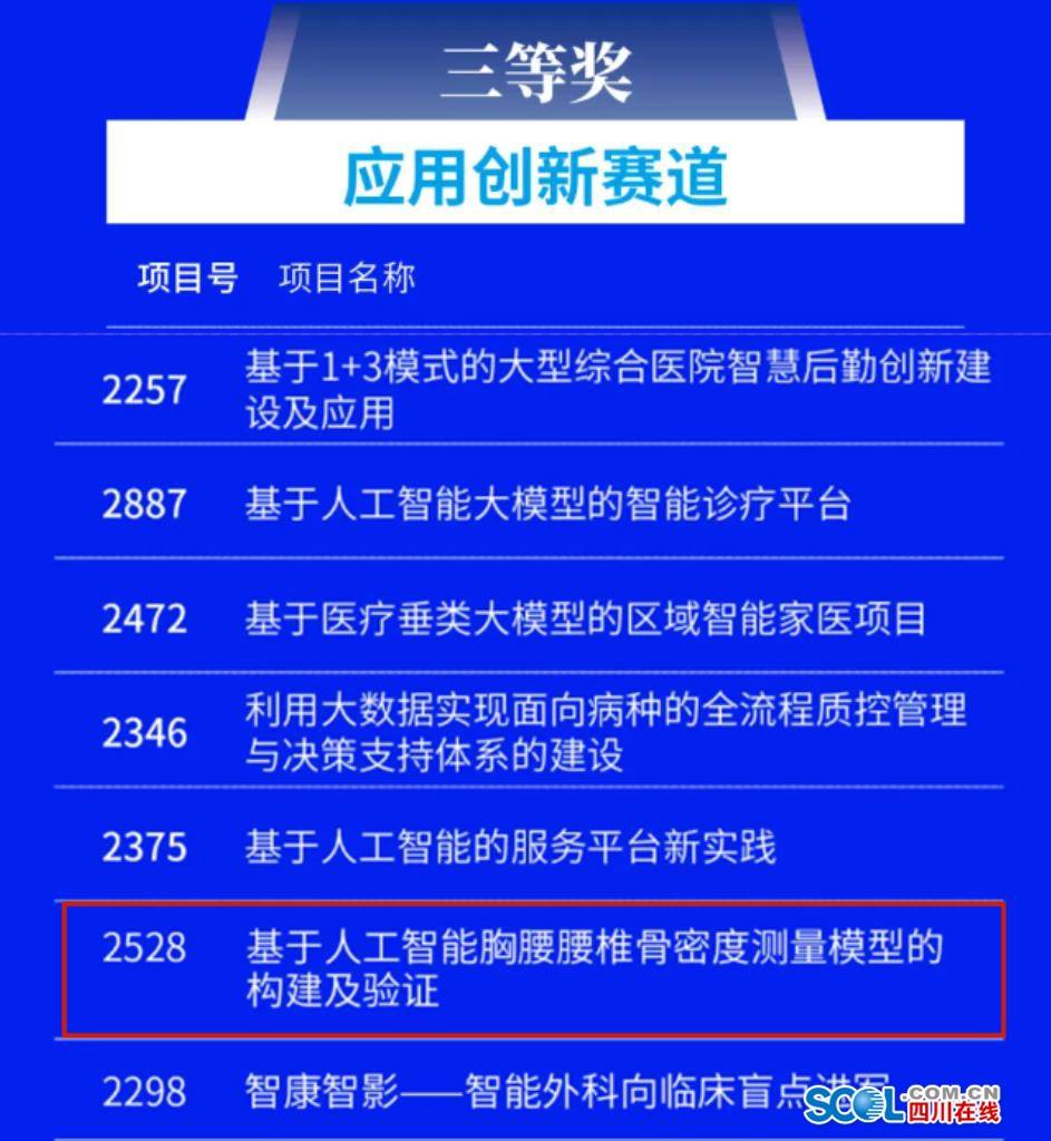 4月29日四川在线从遂宁市中医院了解到,在首届医疗行业数字生态创新大会暨第七届智慧医疗创新大赛全国总决赛上,遂宁市中医院的“基于人工智能胸腰椎骨密度测量模型的构建及验证”项目,从全国769个参赛项目中脱颖而出,获得应用创新赛道“最具发展潜力奖”和“全国三等奖”。